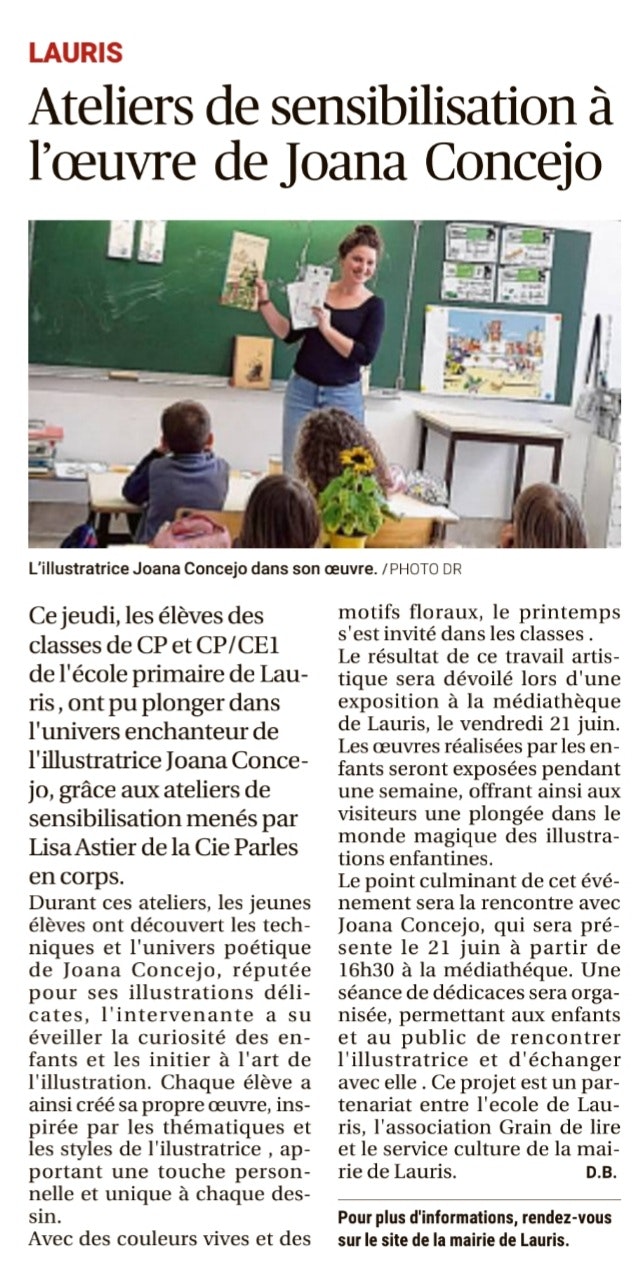 Lisa Astier à réalisé des ateliers de sensibilisation au travail de l'illustratice Joanna Concejo auprès de trois classes de CP et Cp Ce1 de l'Ecole de Lauris et ce vendredi aura lieu l'exposition des enfants et une rencontre dédicace avec l'illustratrice à la médiathèque de Lauris.